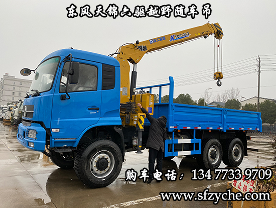 東風天錦六驅隨車吊詳細參數(shù)配置:東風天錦D530一排半駕駛室?guī)Э照{,6×6驅動,康明斯ISDe270 30,國三排放標準發(fā)動機,法士特8JS118變速箱,ZQC1200(機械式)分動箱,前橋6噸,10噸雙后橋,大江車橋輪邊減速,12.5R20越野輪胎帶備胎,軸距4100+1300mm,大梁280mm,電動玻璃,方向助力,斷氣剎,大箱尺寸5000×2400×600mm,底板采用4mm花紋板,采用徐工原廠5噸3節(jié)臂隨車起重運輸機。