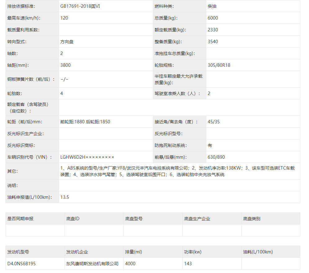 東風(fēng)猛士民用版EQ2063EYY6J型長頭單排四驅(qū)越野底盤是東風(fēng)越野車公司針對(duì)民用方面的首款軍轉(zhuǎn)民產(chǎn)品代表,其繼承東風(fēng)軍用猛士的正規(guī)血統(tǒng),品質(zhì)優(yōu)異,技術(shù)過硬。東風(fēng)猛士民用版EQ2063EYY6J采用東風(fēng)猛士M50型四驅(qū)底盤改造而成,采用東風(fēng)康明斯D4.0NS6B195型國六柴油發(fā)動(dòng)機(jī),195馬力 ,排量4L帶增壓,最大扭矩600/1100-2200(N.m/r/min);猛士5擋軍用手動(dòng)變速箱;分動(dòng)箱為四輪全時(shí)驅(qū)動(dòng)帶高低擋;軸距3800mm;整備質(zhì)量3540kg;核定載質(zhì)量2460kg;輪胎采用305/80R18MPT全鋼子午線輪胎,帶自動(dòng)中央充放氣系統(tǒng);整車總質(zhì)量6000kg,國六B排放全國可上黃牌,整車尺寸:5320*2310*1950mm;最小離地間隙388mm,最大垂直越障400mm,通過性強(qiáng),適應(yīng)高海拔極寒極熱地區(qū),全國暢行無阻,最高車速可達(dá)120km/h。