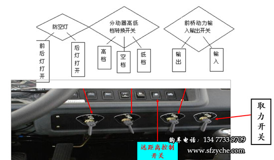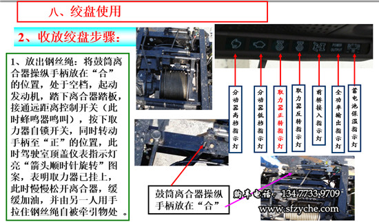 2、收鋼絲繩:拉上駐車制動受控閥,并用木塊,石頭掩住車輪,將鼓筒離合器操縱機構(gòu)手柄放在“合”的位置,變速器處于空檔 ,起動發(fā)動機,踏下離合器踏板,接通遠距離控制開關(guān)(此時蜂鳴器叫),按下取力器自鎖開關(guān),同時轉(zhuǎn)動手柄至“反”的位置,此時駕駛室頂蓋儀表指示燈亮“箭頭逆時針旋轉(zhuǎn)”圖案,表明取力器已掛上,此時慢慢松開離合器,平穩(wěn)加油,即可收卷鋼絲繩,開始牽引。牽引完后,踩下離合器踏板,按下取力器自鎖開關(guān),同時轉(zhuǎn)動手柄至“0”的位置,將鼓筒離合器操縱手柄放在“離”的位置,關(guān)閉遠距離控制開關(guān)。