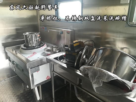 東風(fēng)六驅(qū)越野餐車車輛概述:采用東風(fēng)國五越野底盤改裝, 車廂材質(zhì)采用外冷軋鋼板,內(nèi)飾不銹鋼,中間保溫層,隱藏式上車踏步,頂部安全窗,兩個(gè)副食灶,一個(gè)蒸飯車,抽油煙機(jī),平冷柜,水路,電路,油路等。